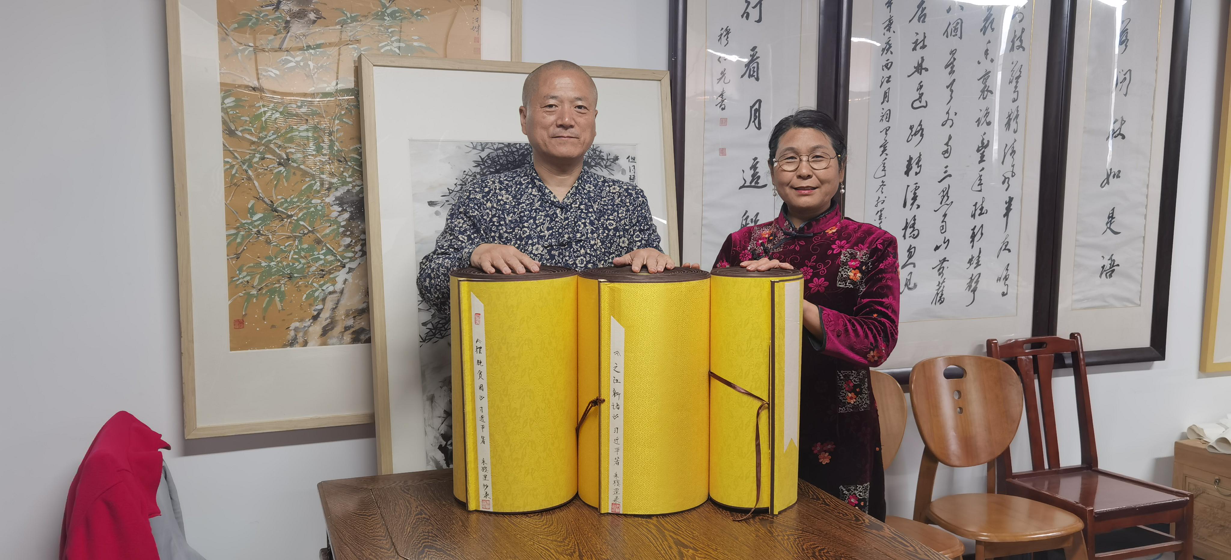 在朱广辉的感染下,他的妻子耿海霞也养成了用毛笔小楷抄写领袖著作的习惯。目前,她抄写的50米长卷《习近平讲故事》已经完成,正在装裱。