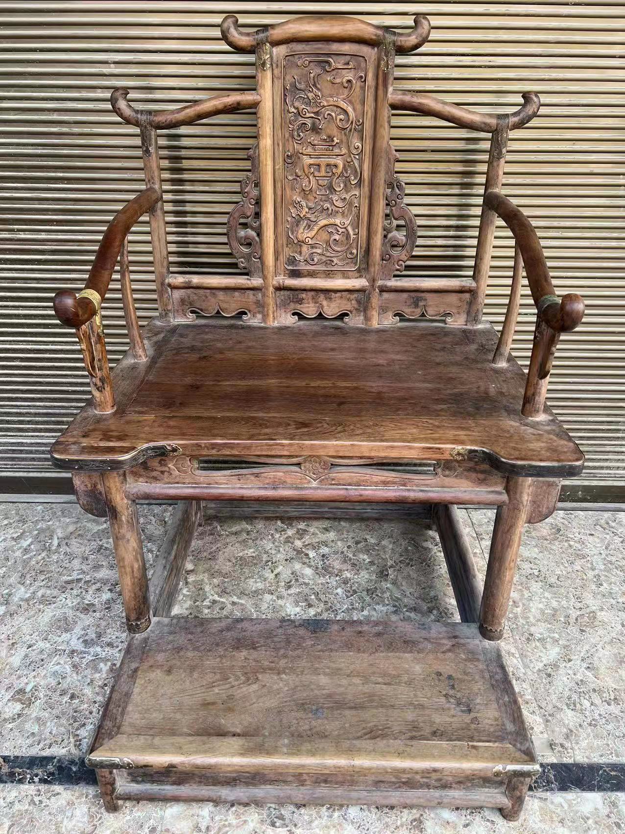此椅经专家鉴定乃乾隆年制,板面油性十足,称之为老油梨。靠背雕有二龙,栩栩如生。中有方几图案上配宝鼎,鬼斧神工,两边两个把手明式传承,包有铜箍。老干部说起椅子,侃侃而谈:在1986年夏天,他去项城王明口镇的袁寨参观袁士凯故居时,听同行村民介绍,附近2公里左右有一农户翻修老房子,院里有一把脏丐丐的大椅子。说者无心,听者有意。他午饭没吃就去看到这个椅子。一看,果然惊喜。遂拿出200元加一盒烟,获此至宝。其中有一把黄花梨椅子在周口市福星公司摆放。